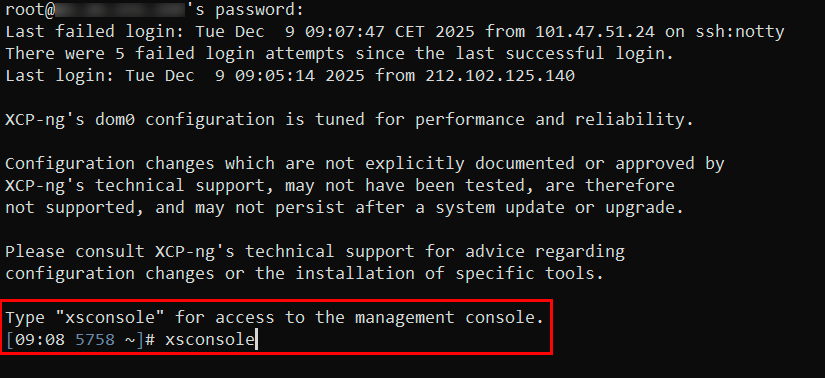 Ввести пароль при запросе. После успешного подключения вы окажетесь в командной строке XCP-ng.