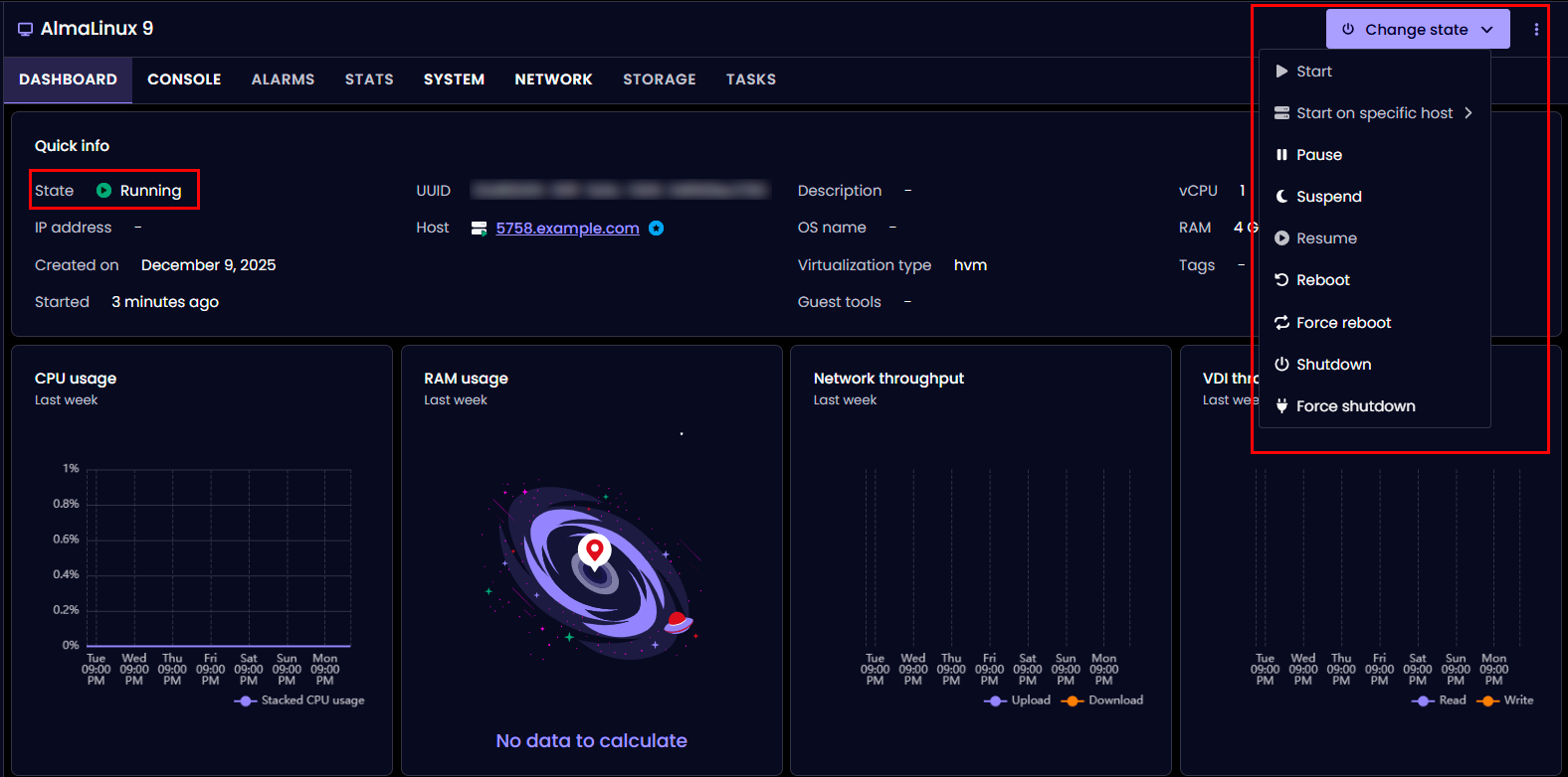 - Change state: меню управления состоянием VM (запуск, пауза, перезагрузка, выключение).